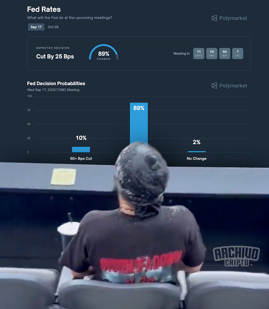 El escenario base del mercado es un -25 pb en septiembre. El -50 pb sigue siendo minoritario, aunque dejó de ser tabú: la discusión ya no es “si” recortan, sino qué tan rápido inicia el ciclo y cómo queda la guía para los meses siguientes. Eso importa para las valoraciones, la pendiente de la curva y el costo de capital que enfrenta todo el complejo de activos de riesgo, cripto incluido.